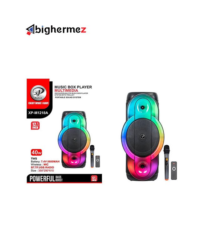 اسپیکر XP-M1218A یک اسپیکر بلوتوث قابل حمل با اندازه 12 اینچ و توان خروجی 40 وات است. این اسپیکر دارای قابلیت TWS است که امکان اتصال دو اسپیکر به یکدیگر را از طریق بلوتوث فراهم میکند. XP-M1218A همچنین دارای یک باتری 7.4 ولت – 3600 میلی آمپر ساعت است که امکان استفاده از آن را تا 8 ساعت پخش مداوم فراهم میکند.