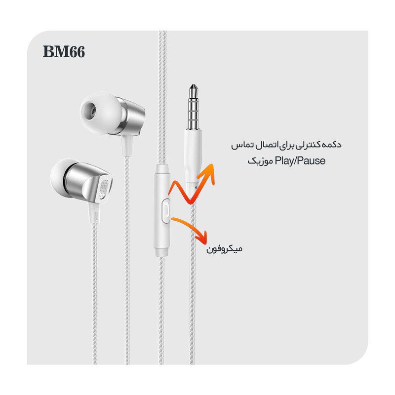 مدل جک هندزفری BM66 بروفون 3.5 میلی متر است که مناسب تلفن همراه و دستگاه هوشمند با این نوع درگاه می باشد. طول سیم هندزفری BM66 بروفون 120 سانتی متر است که فاصله مناسبی بدون کشیدگی یا ایجاد محدودیت را از گوش تا موبایل و لب تاپ و هر دستگاه هوشمندی ایجاد می کند.