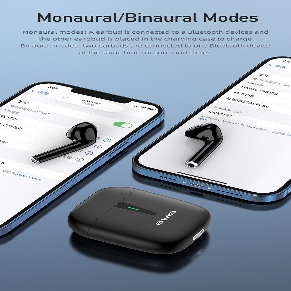 هندزفریهای بلوتوث T21به معنای واقعی بدون سیم هستند. یک جفت هندزفری زیبا و با کیفیت که به دلیل داشتن طراحی ارگونومیک، از گوش خارج نمیشوند. تکنولوژیهای به کار رفته در این محصول، از جمله A2DP/AVRC و نویز کنسلینگ CVC6.0 باعث میشود که صدا از گوش خارج نشود و مزاحمتی برای اطرافیان ایجاد نکند. T21دارای استاندارد ضد تعریق IPX4 میباشد که خیال شما را بابت استفاده از این هندزفری در شرایط مختلف را راحت میکند. پک قابل حمل جذابی که هندزفریها در آن قرار میگیرند تا ۶ بار توانایی شارژ کامل محصول را دارند. برای شما این امکان وجود دارد که انتخاب کنید یکی از هندزفریها کار کند یا هردوی آنها.