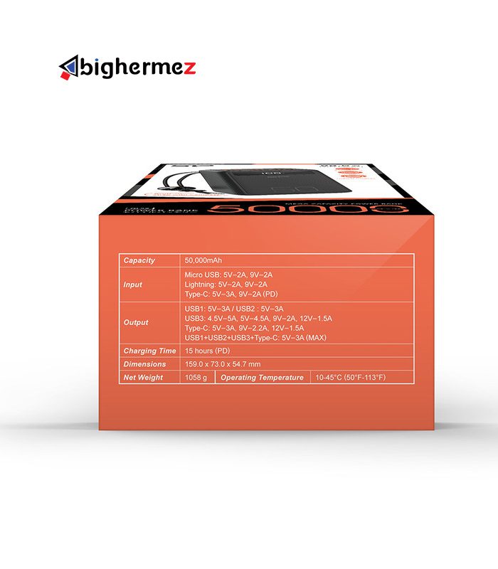 حاوی چراغ قوه حاوی قطبنما بر روی بند آویز پاوربانک دارای نشانگر LCD برای نمایش میزان شارژ امکان شارژ سریع با فناوری پاوردلیوری (PD) دارای اینترفیس تایپ سی، micro-USB، لایتنینگ و USB ابعاد این شارژر همراه نیز ۱۵۹x۷۳x۵۴.۷ میلیمتر |