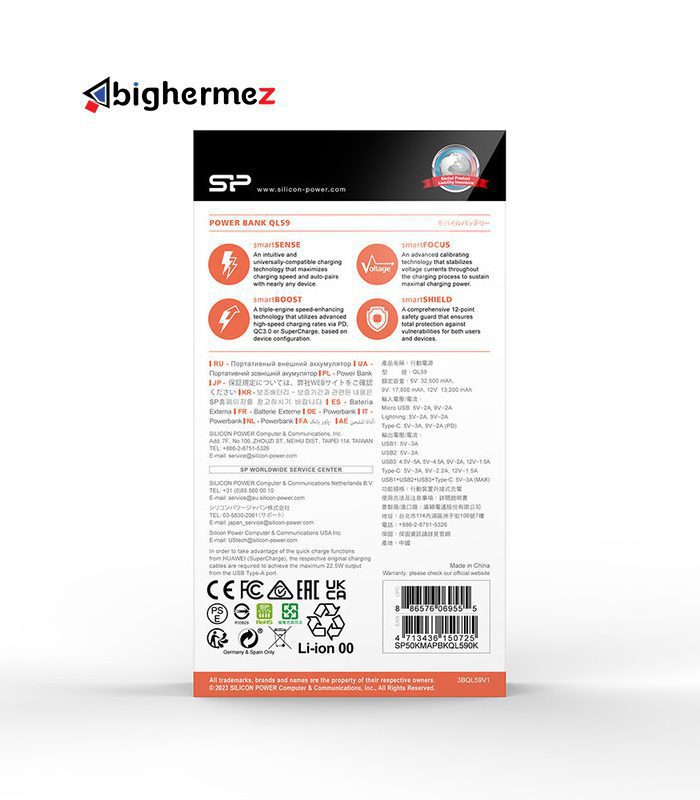 پاوربانک 50000mAh سیلیکون پاور مدل QL59 از سری پاوربانکهای 50000 میلیآمپر. شرکت سیلیکون پاور به منظور شارژ رسانی سریع به تلفنهای هوشمند با سیستم عامل اندورید و iOS و تبلتها تولید میشود. پاوربانک QL59 دارای 6 پورت میباشد که شامل 3 ورودی و 4 خروجی است. دو ورودی micro-usb و لایتنینگ با نرخ 5V/2A و 9V/2A به همراه یک پورت مشترک ورودی و خروجی تایپ سی با فناوری پاوردلیوری (PD) با نرخ ورودی 5V/3A و 9V/2A میباشد.