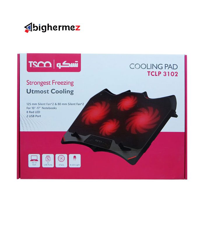 پایه خنک کننده تسکو مدل TCLP 3102 محصولی از شرکت «تسکو» است که میتواند به خوبی اقدام به کاهش دمای لپتاپ کند. این کول پد به درگاه USB لپ تاپ متصل میشود. و دارای دو فن 125 میلیمتری و 2فن 80 میلیتری است. وجود این چهار فن در این کول پد باعث ایجاد جریان هوای خنک و خروج راحتتر هوای گرم لپ تاپ میکند. با توجه به ابعاد TCLP 3102، این کول پد میتواند لپتاپهای تا سایز 17 اینچ را پشتیبانی کند. سرعت چرخش در فنهای TCLP 3102 برابر با 1500 دور بر دقیقه است.